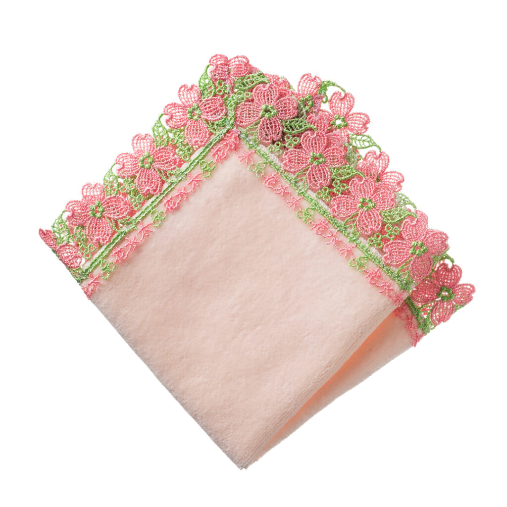 ハンカチはタオル地をベースに、繊細な刺繍やモチーフを施したデザインが多く、 近沢レースの上品さにも通じる雰囲気があります。