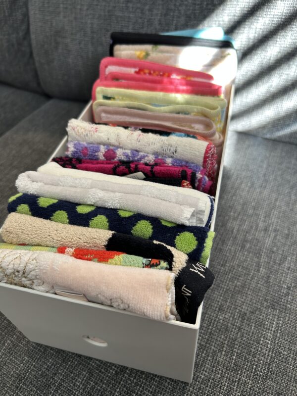 畳んだハンカチを“本のように立てて収納”すると、型崩れせずにスッキリ。 お気に入りの柄を眺めながら選ぶ時間も楽しくなりますよ。