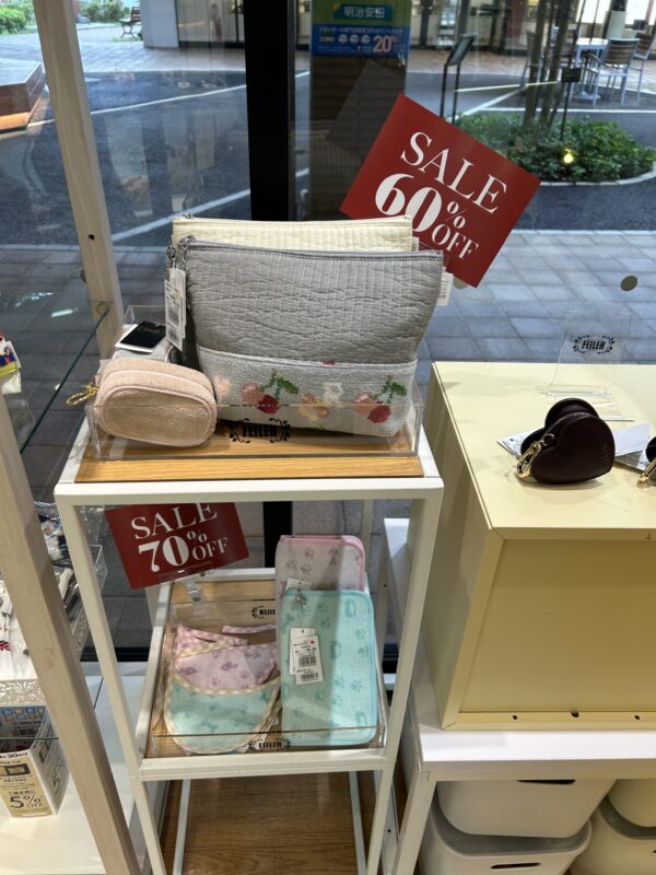 たとえば、人気のハンカチ(定価2,750円)が2,200円で並んでいたり、ポーチ類が20%OFFで販売されていることもあります。