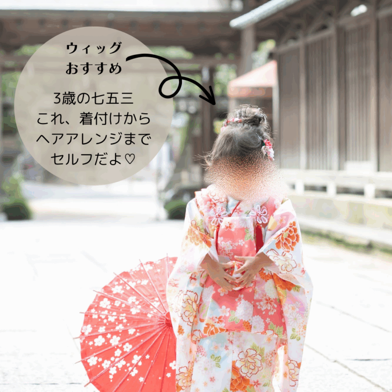 私は車で神社に行き、髪の毛のセットは現地で行いました。車内で軽く整え、神社に着いてからウィッグシュシュを巻き付けるだけなので、崩れの心配もなし。