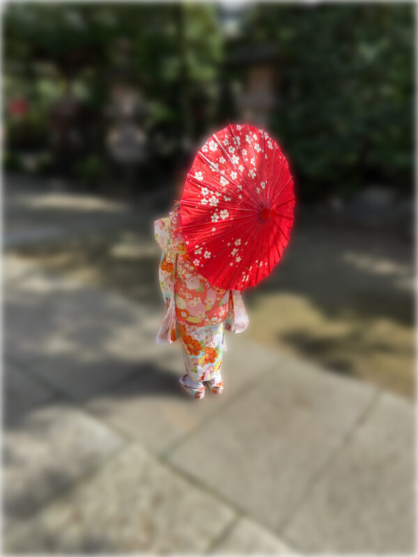 また、七五三をメインにしているカメラマンさんは撮影小物を持っていることも多く、和傘や扇子などを貸してくれる場合もあります。実際、今回の撮影でも和傘を持ってきてくださって、写真の印象がぐっと華やかになりました。